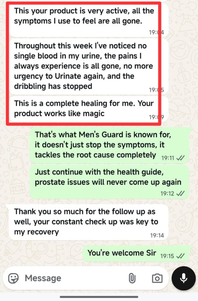 My enlarged prostate made traveling impossible. I couldn’t drive for 30 minutes without looking for a place to urinate. It was humiliating. After using Men’s Guard Herbal Remedy, that problem ended completely. Now I can drive from Owerri to Enugu nonstop! This is not hype this remedy truly works.